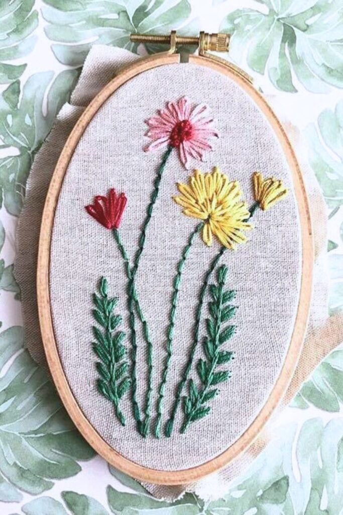 Stitch three or four flowers in a cluster — daisies, lavender, small roses — anything simple. Add greenery around it, and you’ve got a gorgeous piece perfect for gifting.